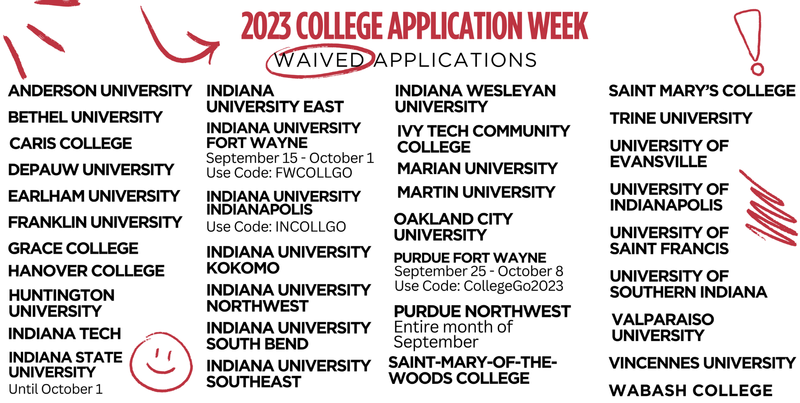 Find out application information for the colleges you plan to apply to, including if they’ll be waiving their fees, by visiting LearnMoreIndiana.org/college/applying-to-schools/#app-process. While you’re there, be sure to read through the list of things you’ll need before you start your applications. You can use this list to help you gather everything you’ll need. If you’re still figuring out what colleges may be a good fit, set up an appointment with your counselor. You can also start your research using this worksheet.