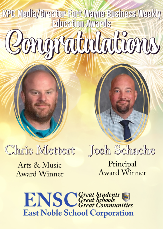 Over the last 3 and a half months, KPC Media and The Greater Fort Wayne Business Weekly have been accepting and analyzing nominations for their annual Education Awards. They received submissions from 7 counties across Northeast Indiana. The judges looked over each nomination carefully, and chose the nominee based on the qualitative and quantitative information given. We are so excited to announce that East Noble School Corporation had not just one, but two of our staff members selected as award winners! Chris Mettert, Choir Teacher and Show Choir Director at the High School was the Award Winner for the Arts and Music Award and Josh Schache, Assistant Principal at the High School, was selected as the Award Winner for the Principal Award. We are so honored to have amazing educators and administrators in our buildings, and we love when they are recognized for all the hard work they do!