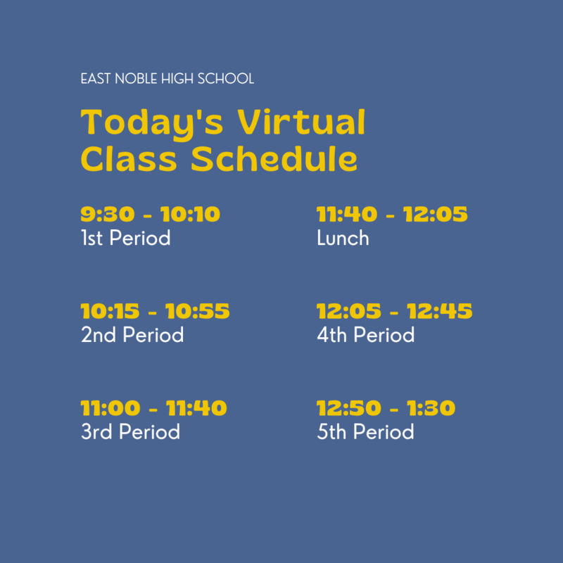 When East Noble Schools close for a Virtual Learning Day, teachers and students will follow the schedule below. Students will find the links to their live meetings on each course's Canvas page.